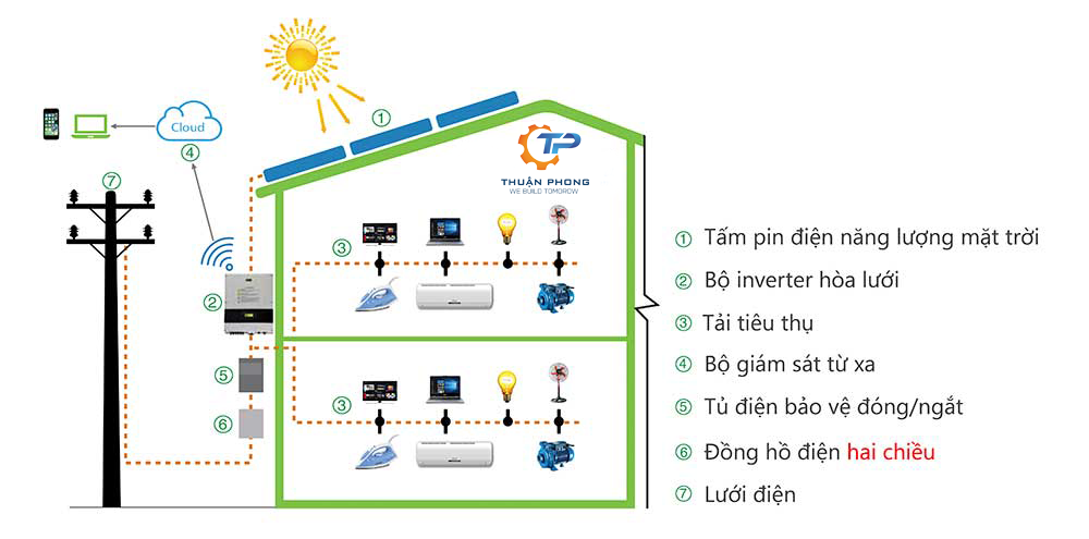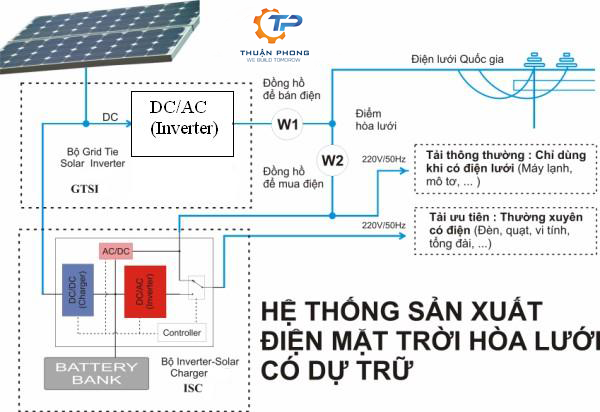 + Khi thiết kế hệ thống hòa lưới thì thiết kế sao cho công suất hòa lưới ≤ công suất tải tiêu thụ