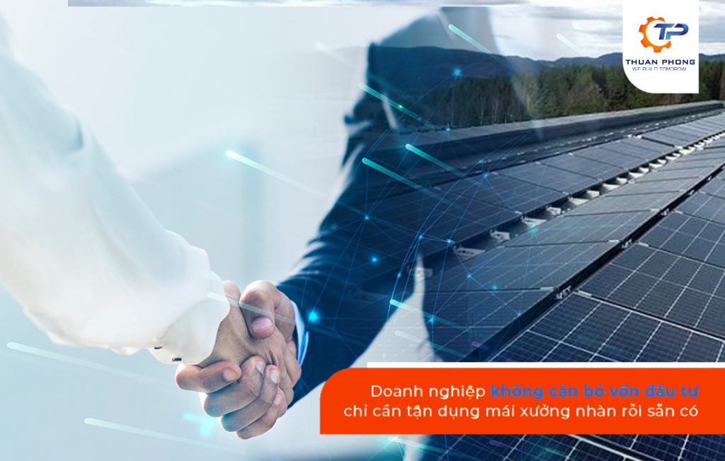 Bằng cách tận dụng phần diện tích mái nhàn rỗi, doanh nghiệp sẽ được lắp hệ thống điện mặt trời mà không cần bỏ vốn. Toàn bộ kinh phí lắp đặt hệ thống sẽ do đối tác tài chính chi trả. DAT Solar sẽ là tổng thầu EPC cho dự án, khảo sát, thiết kế, cung cấp thiết bị, lắp đặt, vận hành và bảo dưỡng cho toàn hệ thống điện mặt trời. Hằng tháng, doanh nghiệp chỉ cần trả tiền điện từ hệ thống cho đối tác tài chính với giá thấp hơn giá của EVN. Khi kết thúc hợp đồng, doanh nghiệp có quyền ký thuê tiếp hoặc thừa hưởng lại hệ thống với giá tượng trưng 1 USD.