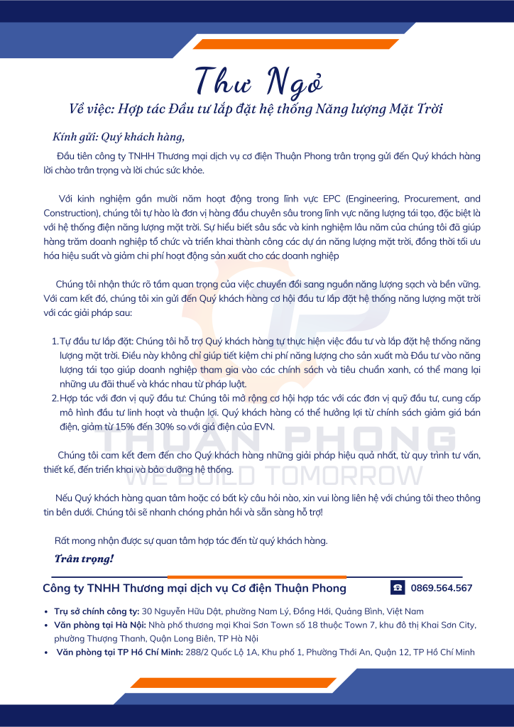 Tin tức Thư ngỏ về việc hợp tác lắp đặt hệ thống Năng lượng Mặt trời Thuận Phong Posted on 06/12/202306/12/2023 by Khánh Vân 06 Th12 SỬ DỤNG ĐIỀU HÒA KHÔNG LO TỐN ĐIỆN BẰNG GIẢI PHÁP NĂNG LƯỢNG MẶT TRỜI Thông báo nghỉ Tết Dương lịch 2024